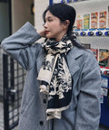 披肩式圍巾由墨黑與米白交織而成,水墨畫筆觸的綺麗場景,為風格勾勒出詩意與優雅的畫面。溫暖而輕盈,不再需要外套的厚重拘束,舉手投足間多了一份流動的線條感與優雅層次。